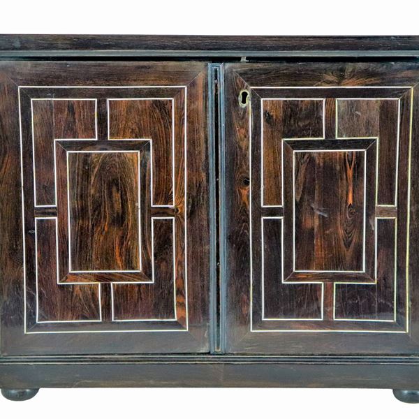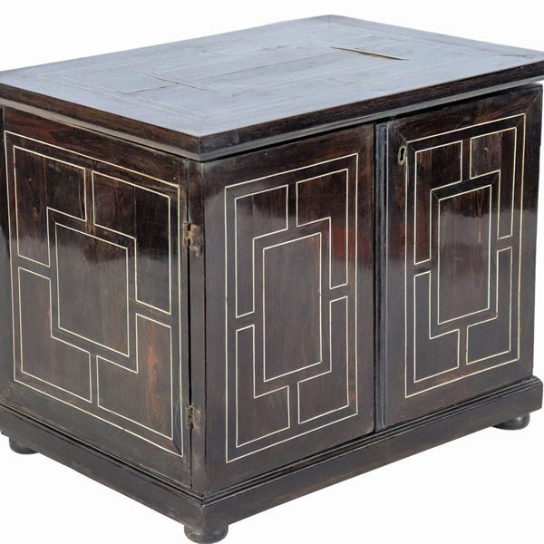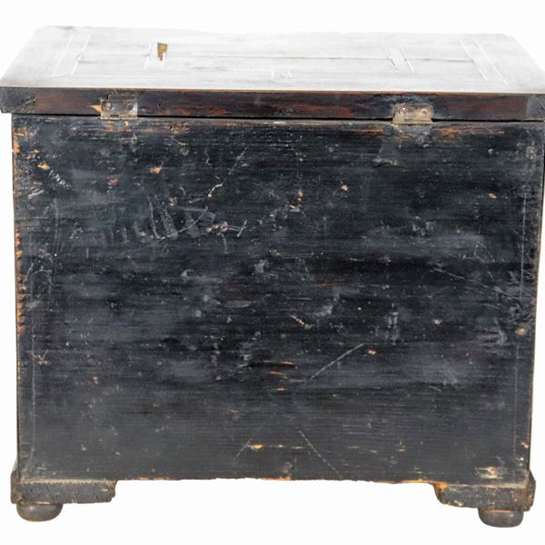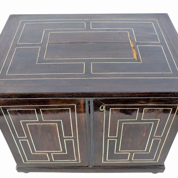 Antico piccolo scrigno portamonete in noce con intarsi geometrici, all'interno serie di tiretti e colonnine, piano apribile e due sportelli [..]
