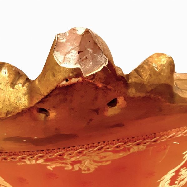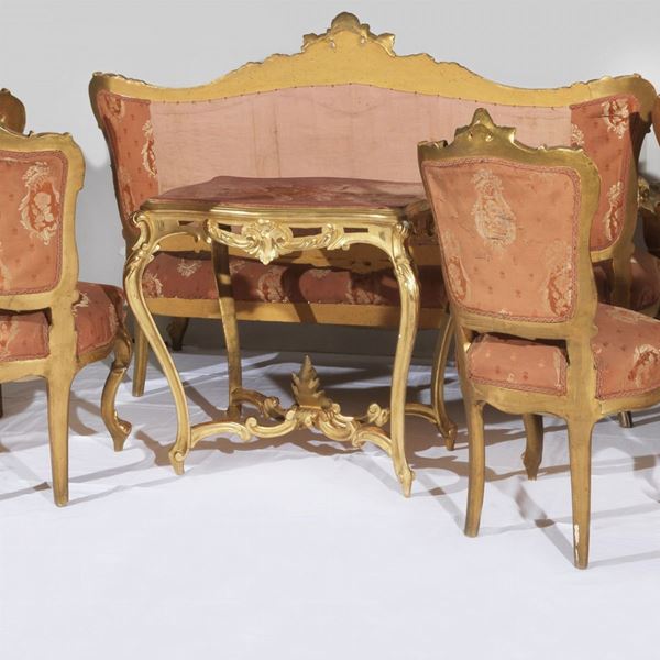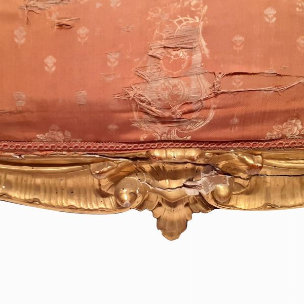 Antico salotto napoletano Luigi Filippo (1830-1848), in legno dorato e riccamente intagliato a motivi di conchiglie, volute di foglie d'acanto [..]