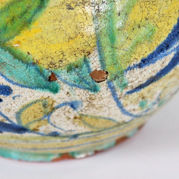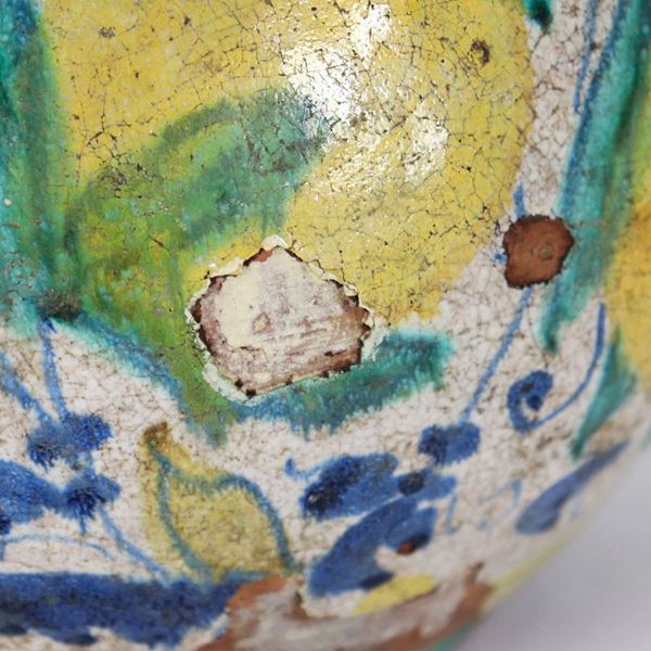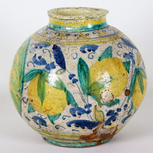 Antico vaso a boccia in maiolica italiana, con decorazioni variopinte a motivi di uccello, fiori e limoni. Qualche mancanza e cadute di color [..]