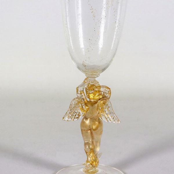 Bicchiere in vetro soffiato di Murano con scaglie dorate, il fusto con figurina di "Putto alato". Un'ala è incollata