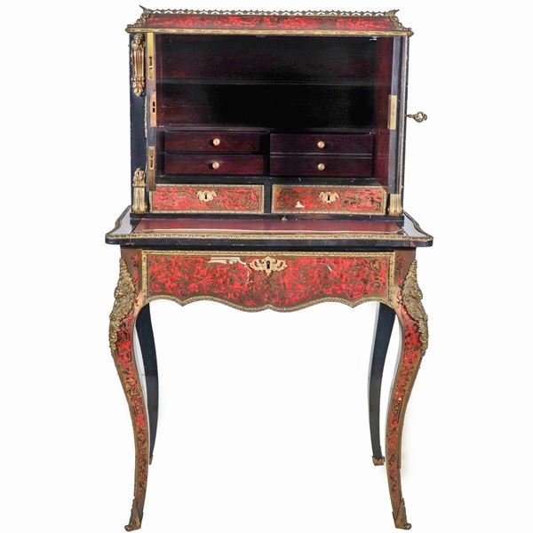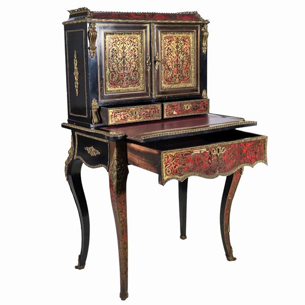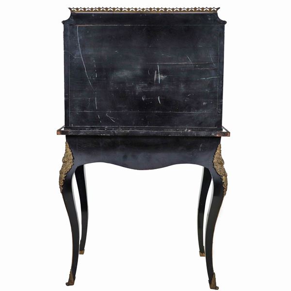 Bonheur du jour francese Napoleone III (1852-1870), in legno ebanizzato con intarsi alla maniera Boulle e fregi e guarnizioni in bronzo dorato [..]