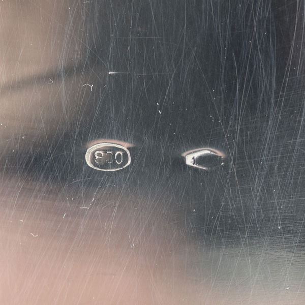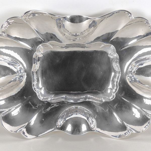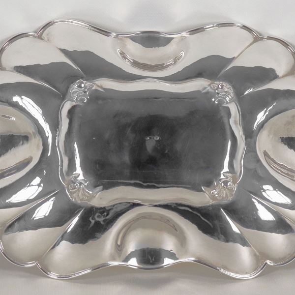 Centrotavola rettangolare in argento cesellato e sbalzato a forma sagomata, sorretto da quattro piedini ricurvi, gr. 685