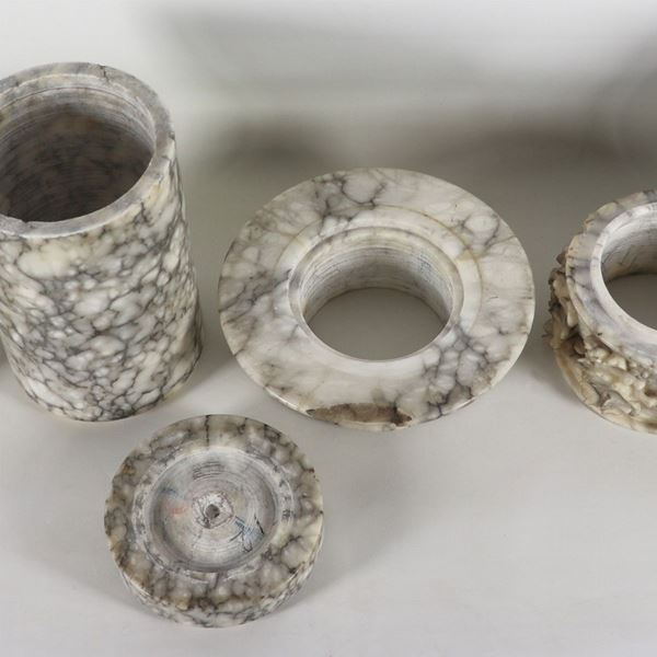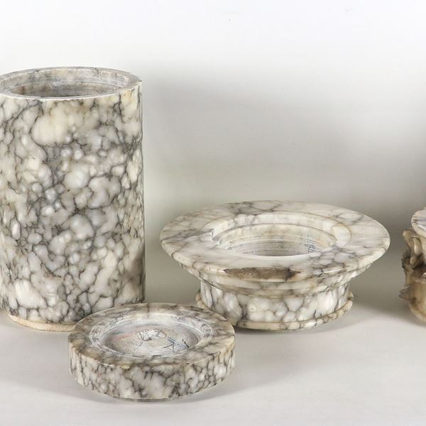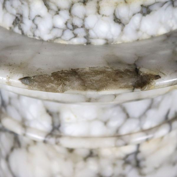 Colonna tonda rivestita in marmo grigio venato, con struttura interna vuota. Lieve mancanza