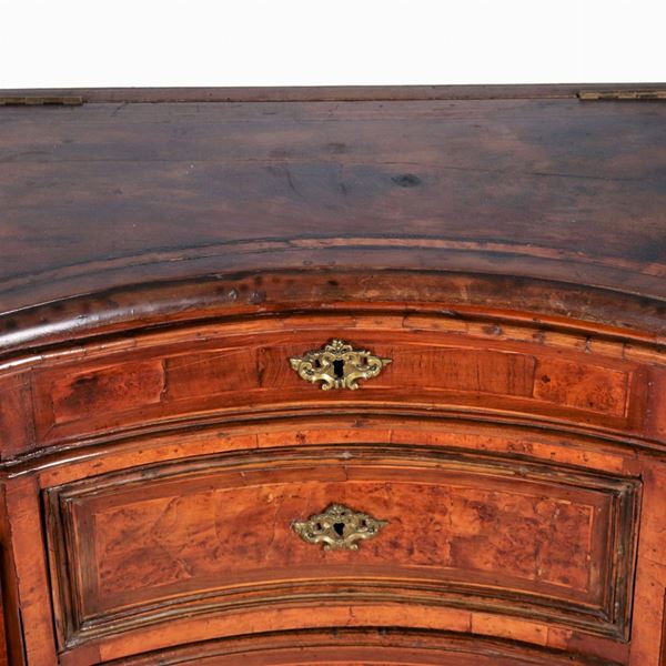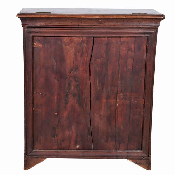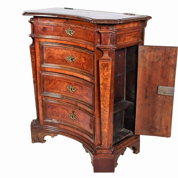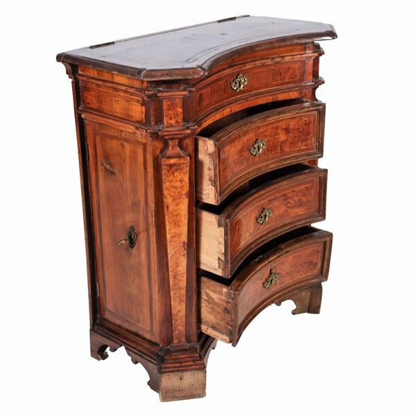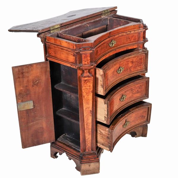 Comodino romano Luigi XIV in noce, con filettature intarsiate a motivi geometrici, piano apribile, tre tiretti sottostanti e due sportelli la [..]