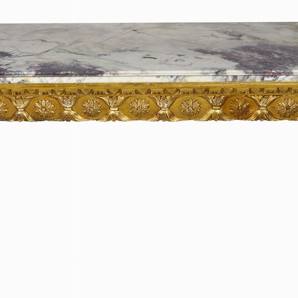 Consolle francese di linea Luigi XVI, in legno dorato e intagliato a motivi di fiocchi e rosoni, quattro gambe a cono scannellato e piano in [..]
