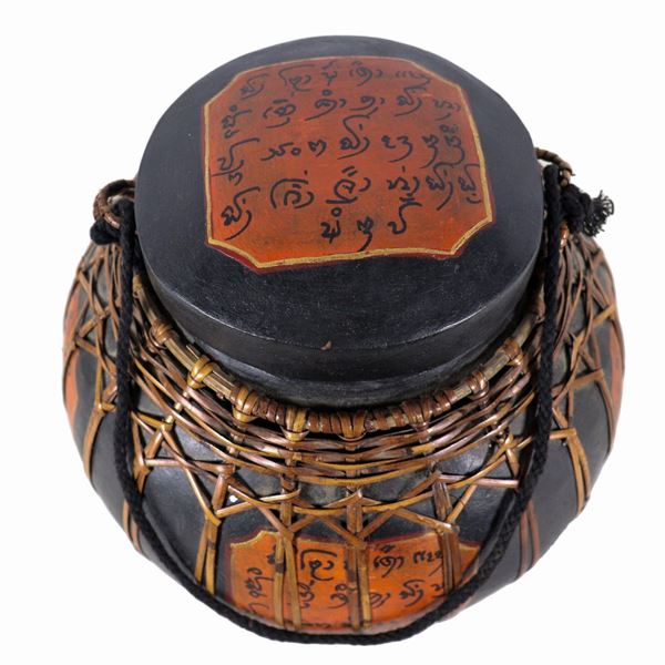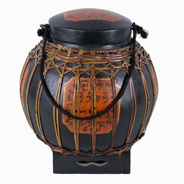 Contenitore orientale per cibo in cartapesta laccata nera, decorata a riquadri con iscrizioni e guarnizioni in bamboo