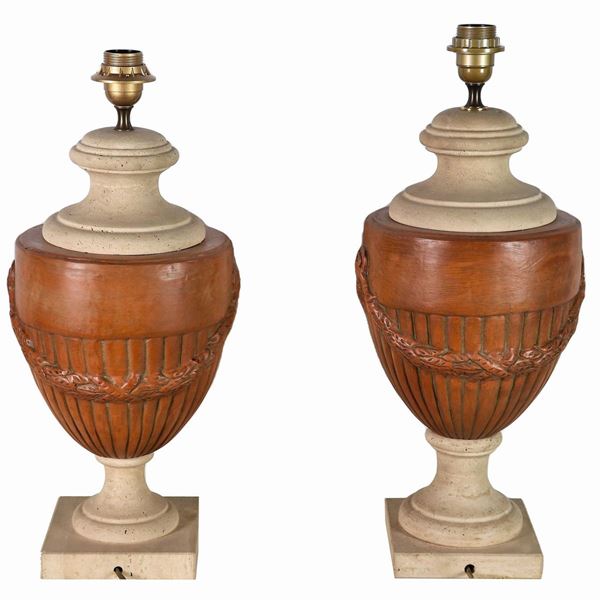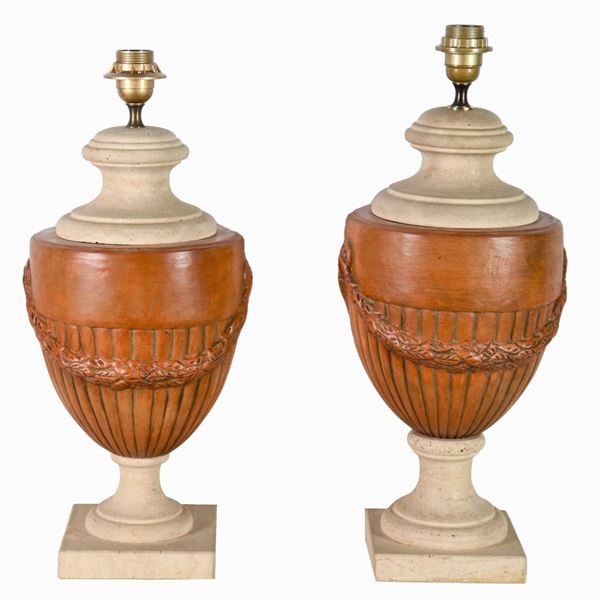 Coppia di anfore in ceramica decorate a finto marmo avorio e marrone, leggermente differenti nelle misure