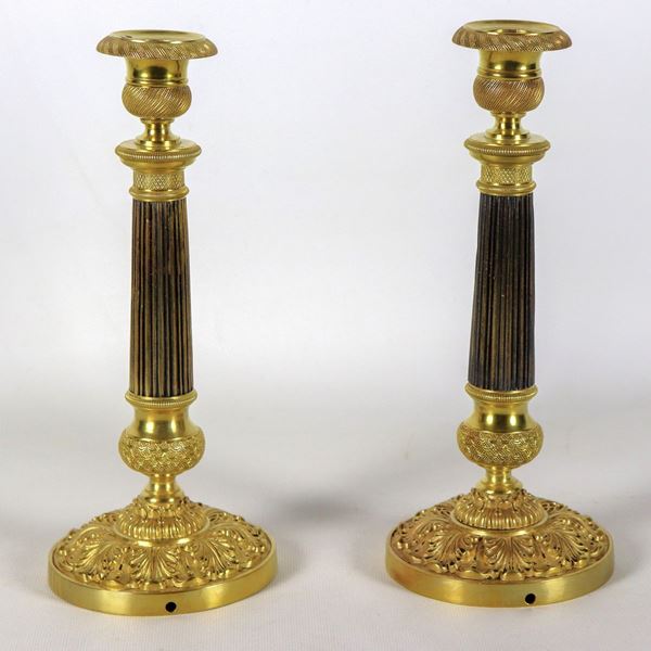 Coppia di antichi candelieri francesi Impero in bronzo dorato, patinato, cesellato e sbalzato, fusti a forma di colonne neoclassiche.