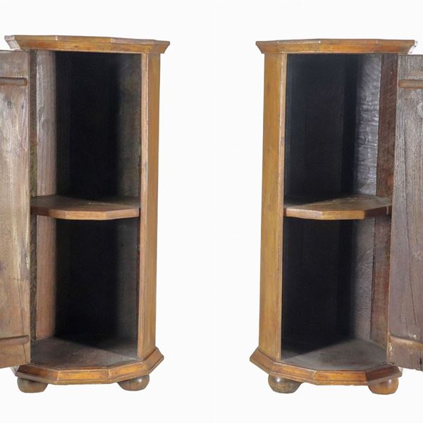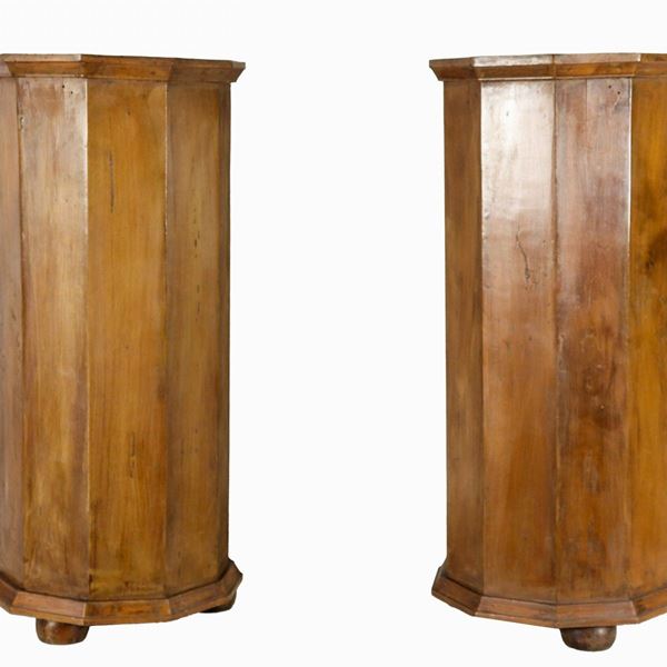 Coppia di antichi comodini in noce a forma di colonne sfaccettate, un tiretto centrale ciascuno