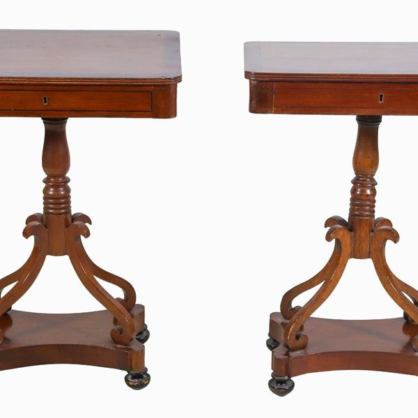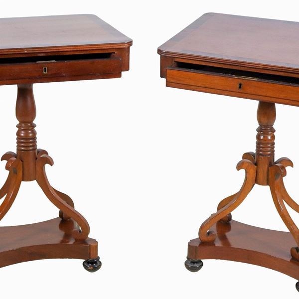 Coppia di antichi tavolinetti rettangolari in noce e palissandro, con tiretto centrale e base a colonna tornita sorretta da quattro gambe ric [..]