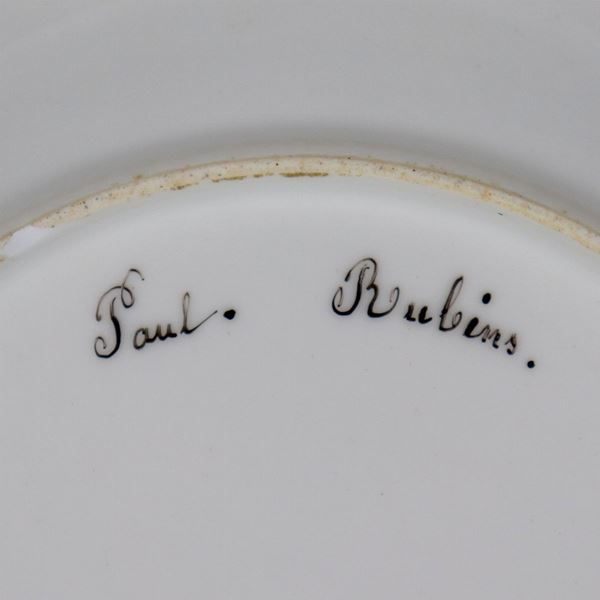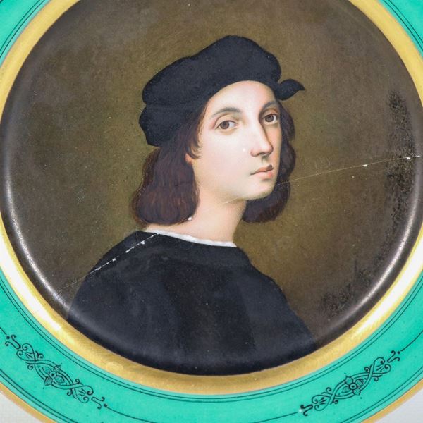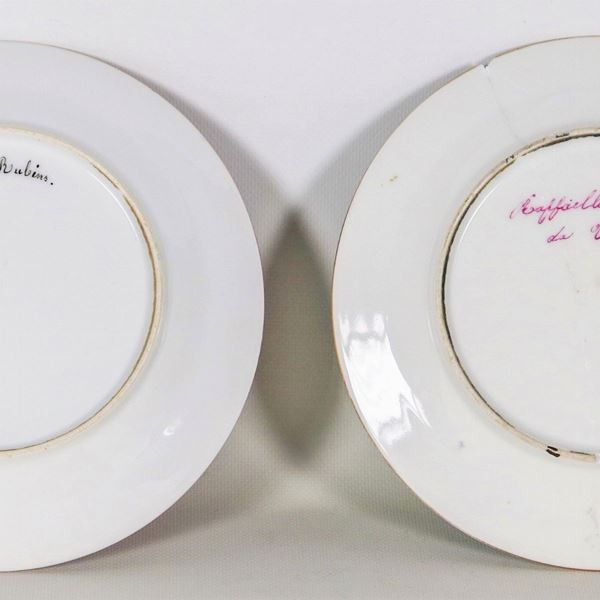 Coppia di piatti da muro in porcellana, con medaglioni dipinti "Raffaello Sanzio" e "Paul Rubens". Un piatto presenta rotture