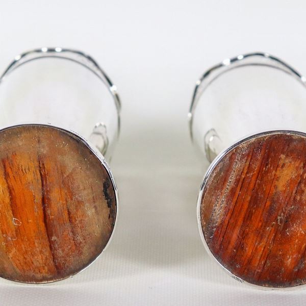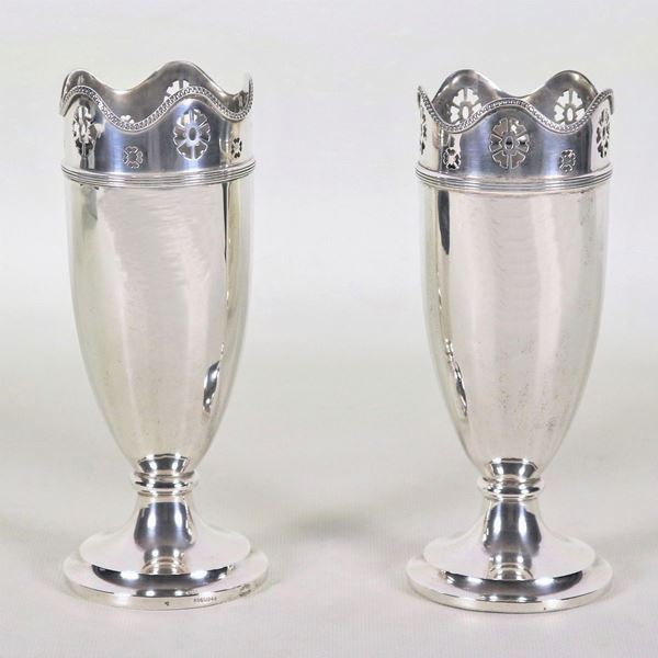 Coppia di piccoli vasi Liberty in argento, con bordi centinati e traforati, gr. 330 circa