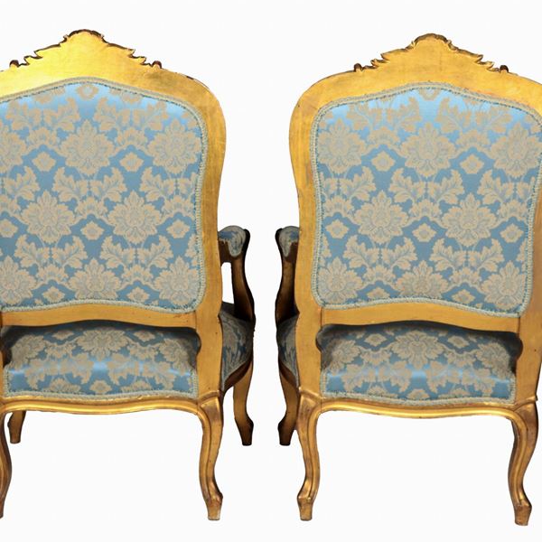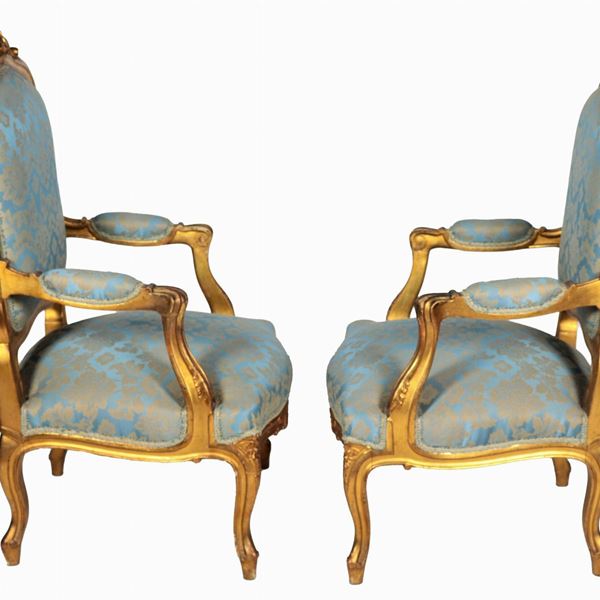 Coppia di poltrone romane di linea Luigi XV, in legno dorato e intagliato a motivi di foglie d'acanto e conchiglie, braccioli e gambe ricurve. [..]