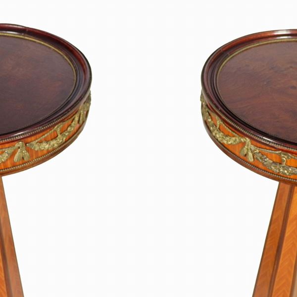 Coppia di tavolini francesi da centro a trespolo, in radica di tuja e bois de rose, con fregi e guarnizioni in bronzo dorato e cesellato a motivi [..]