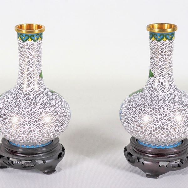 Coppia di vasetti cinesi in smalto cloisonnè con decorazioni di fiori e foglie