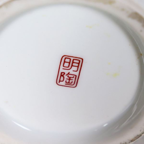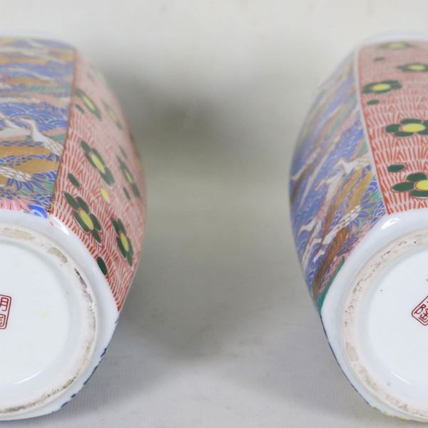 Coppia di vasi cinesi esagonali in porcellana, con decorazioni in smalto a rilievo a motivi di fiori e uccelli