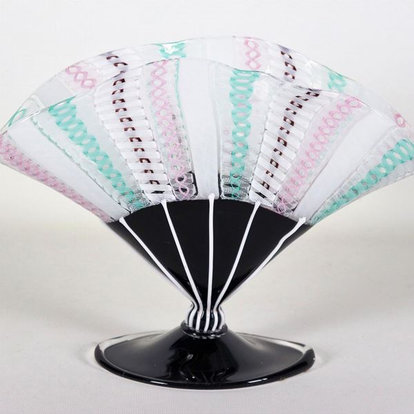 Fulvio Bianconi, Venini Murano 1948-1950 ca., vaso a ventaglio in vetro soffiato ad incalmo, con base nera decorata con canne lattimo e canne [..]