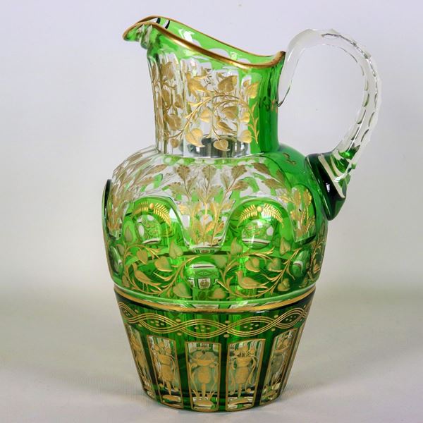 Grande brocca in cristallo di Boemia verde, interamente decorata e incisa in oro zecchino a volute floreali, vasi con fiori e volatili