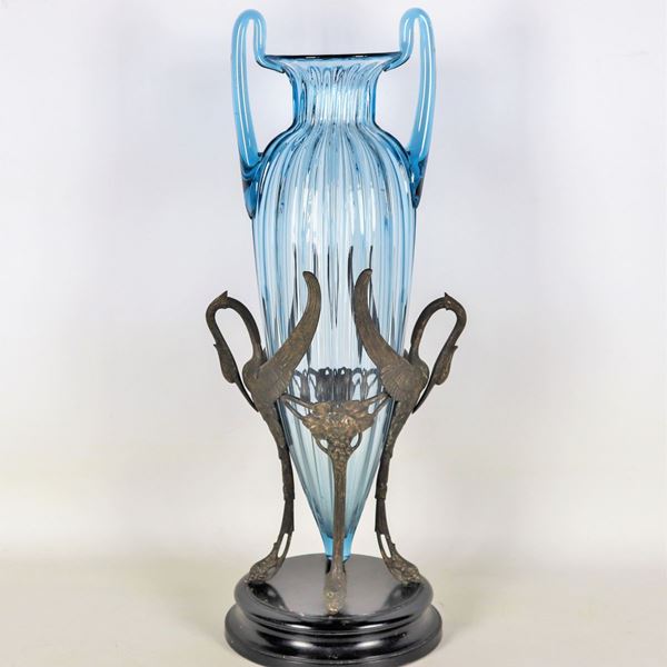 Grande vaso francese Liberty ad anfora in vetro soffiato, con sculture di cigni in bronzo poggianti su base tonda in legno ebanizzato
