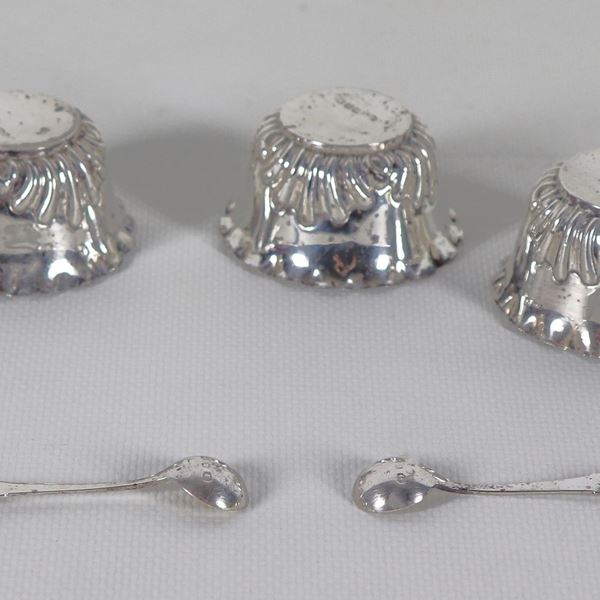 Lotto di quattro antiche salierine con cucchiaini Epoca Regina Vittoria, in argento sbalzato e cesellato, gr. 80