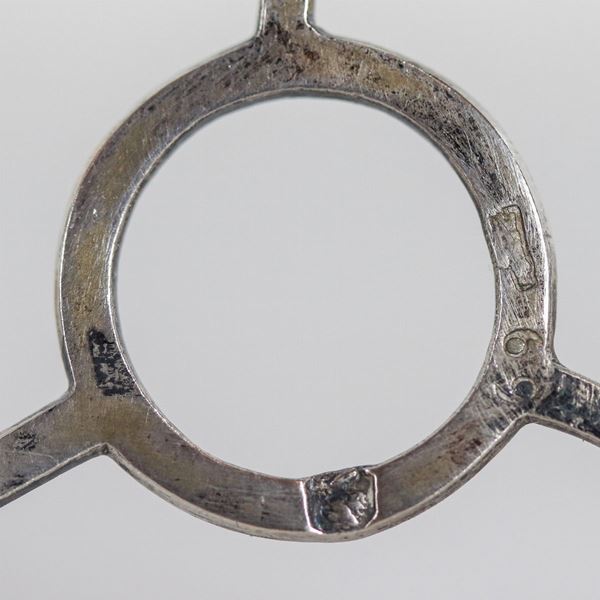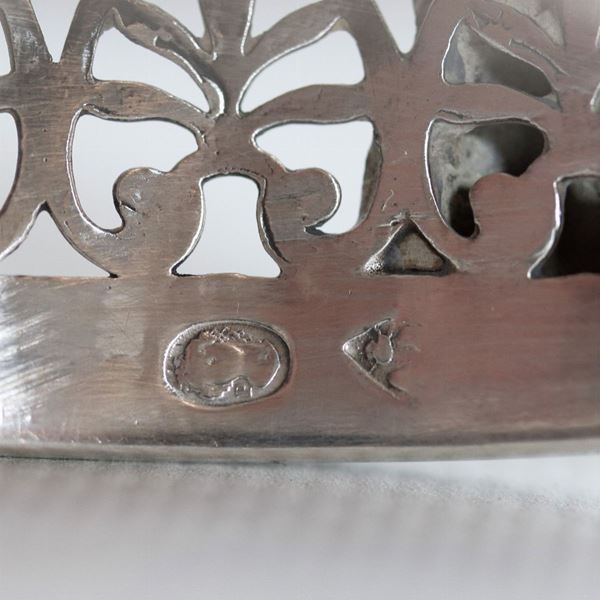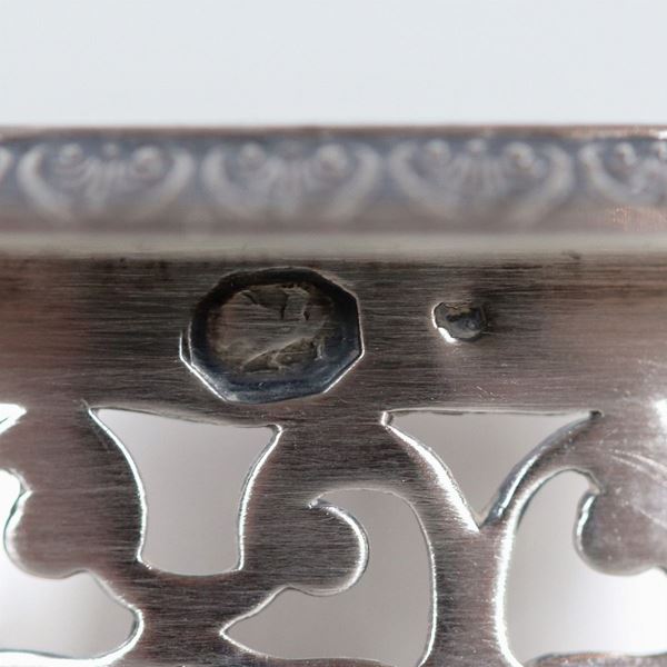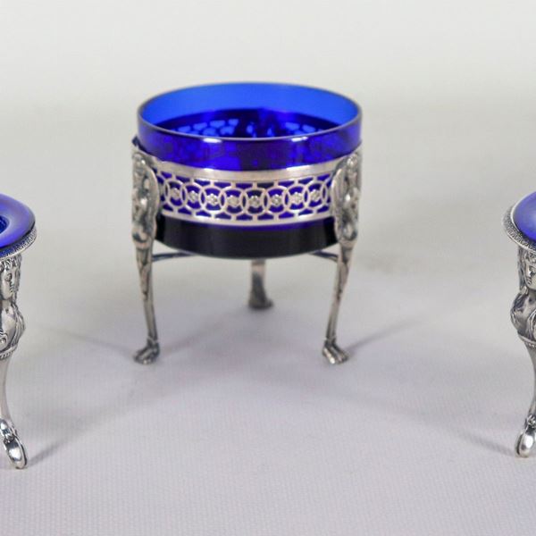 Lotto di tre saliere francesi Epoca Impero in argento, cesellate e sbalzate a motivi neoclassici con vaschette in cristallo blu cobalto, due [..]