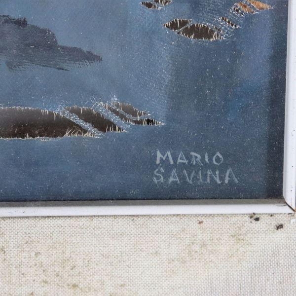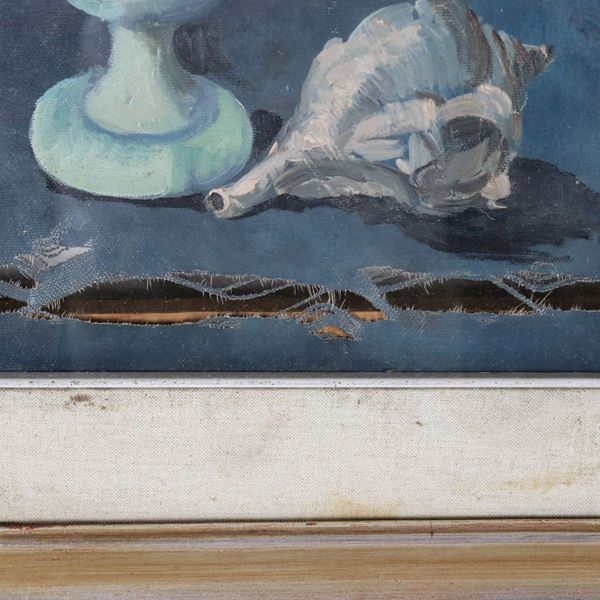Firmato. "Fiori e conchiglie", dipinto ad olio su tela, la tela è danneggiata
