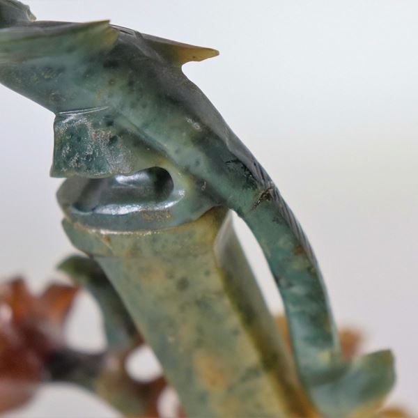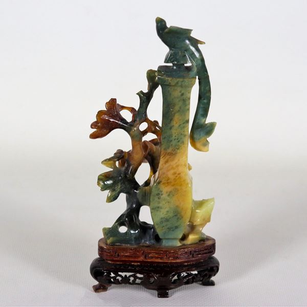 Piccolo gruppo cinese in giada verde "Vasetto con fiori e uccello esotico", difetto e mancanza