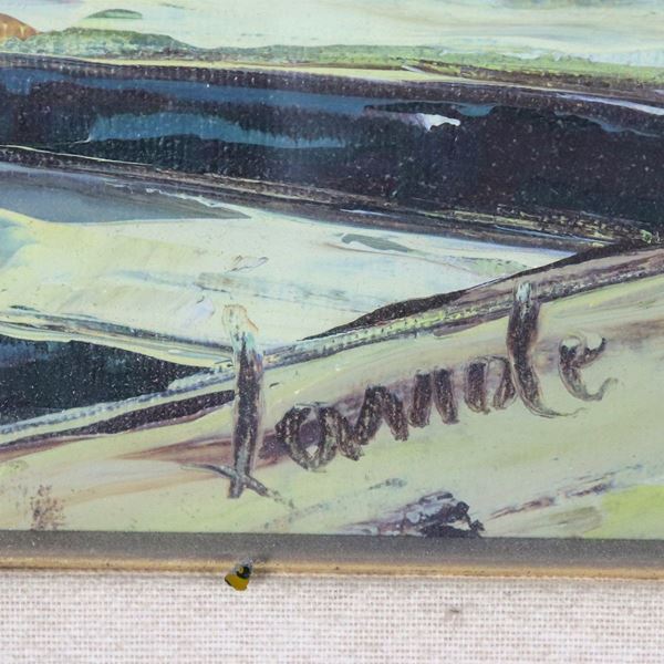 Firmato. "Scorcio di paese con scalinata", dipinto ad olio su tela