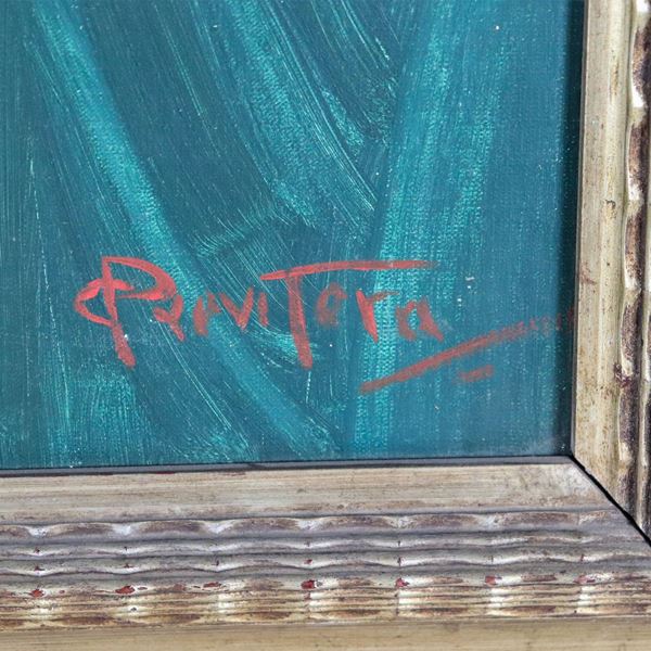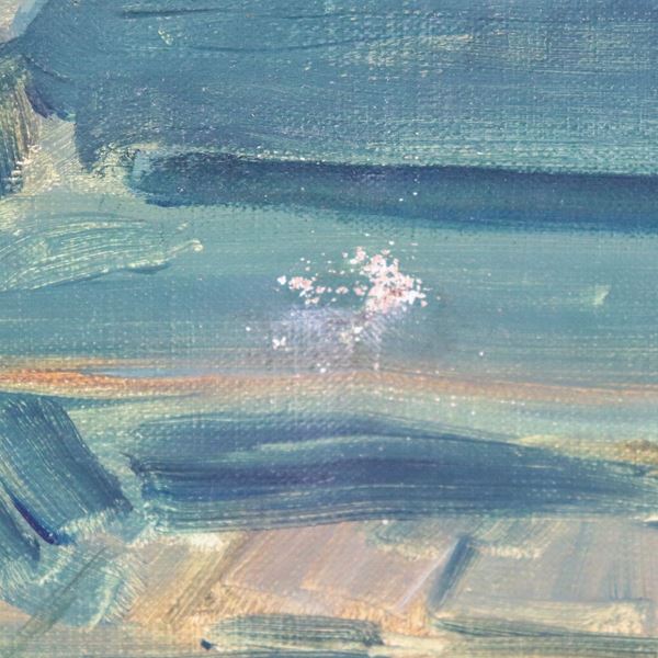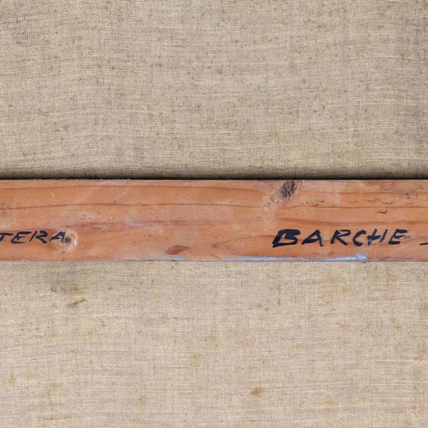 Firmato. "Barche sul fiume", dipinto ad olio su tela. Difetto alla tela