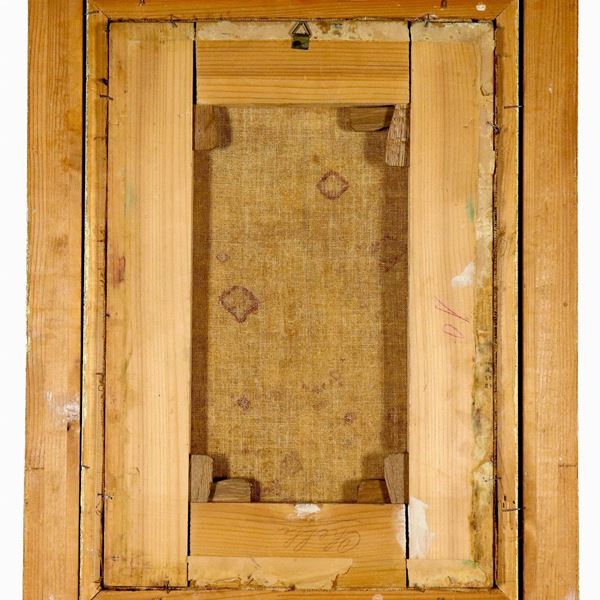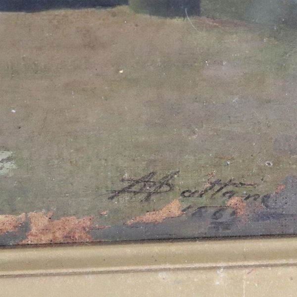 Firmato e datato 1869. "Interno di antico palazzo con scalinata", dipinto ad olio su tela