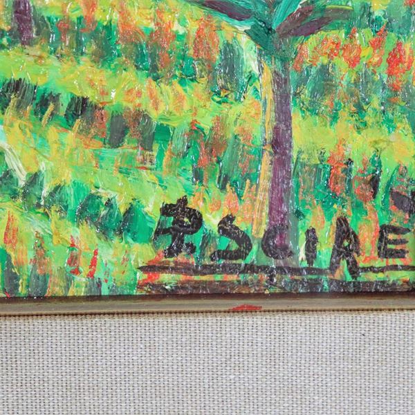 Firmato. "Paesaggio contadino con case e alberi", dipinto ad olio su tela
