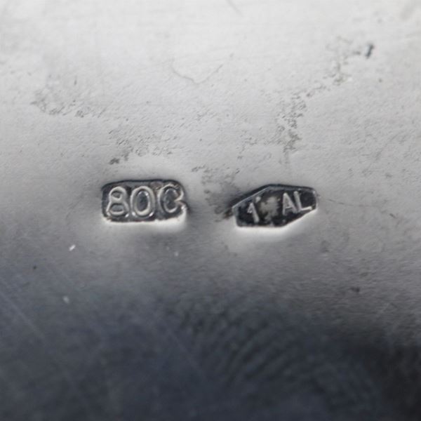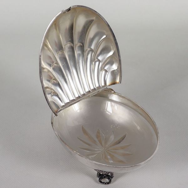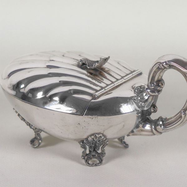 Portaburro in argento cesellato e sbalzato a forma di conchiglia con manico ricurvo e quattro piedini, all'interno vaschetta in cristallo, gr. [..]