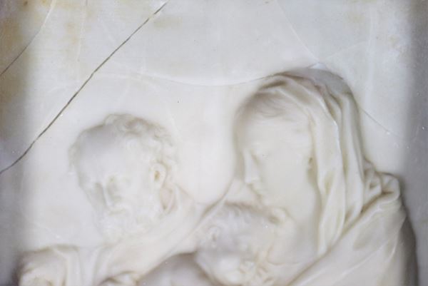 "Sacra Famiglia", piccola placca in marmo alabastrino in cornice a bacheca in legno ebanizzato. Qualche rottura