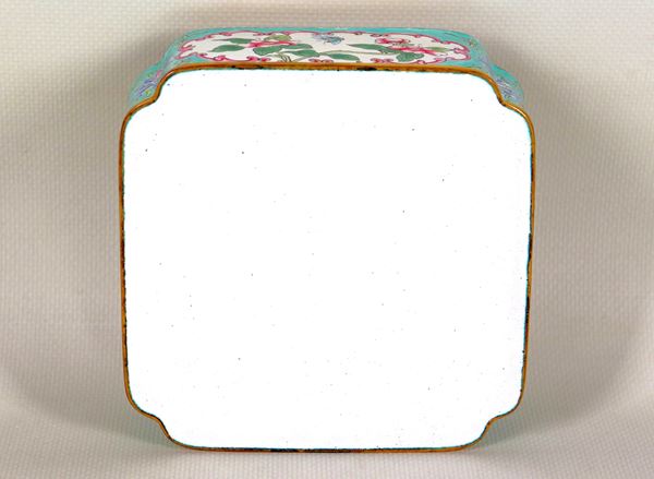 Scatola cinese quadrata in porcellana smaltata celeste, con decorazioni in smalti a rilievo a motivi floreali