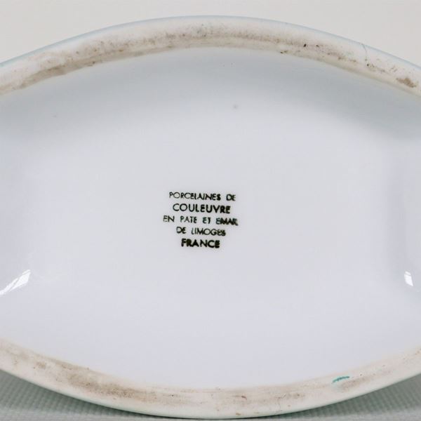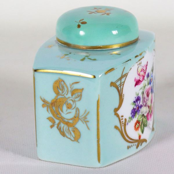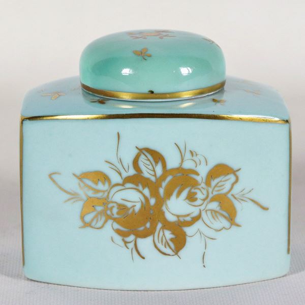 Scatola portatè in porcellana celeste di Couleuvre - Limoges, con decorazioni a rilievo a mazzetti di fiori e lumeggiature in oro zecchino