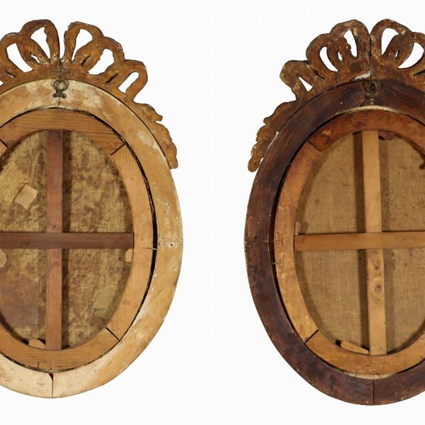cornici in legno dorato con cimase intagliate a motivo di fiocco, cm 59 x 44 ciascuno.