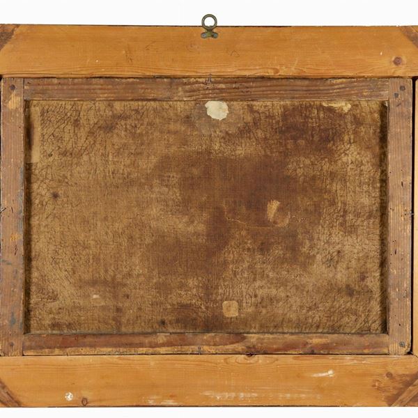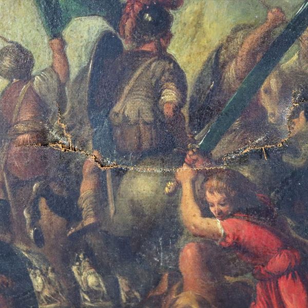 "Scena di battaglia biblica", dipinto ad olio su tela che presenta un taglio