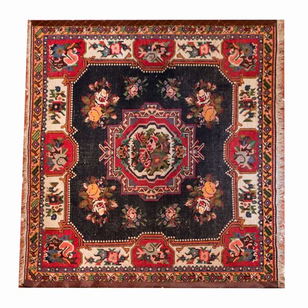 Tappeto persiano Kazakh a disegno geometrico e floreale su fondo blu, rosso e bianco, M 1,65 X 1,48