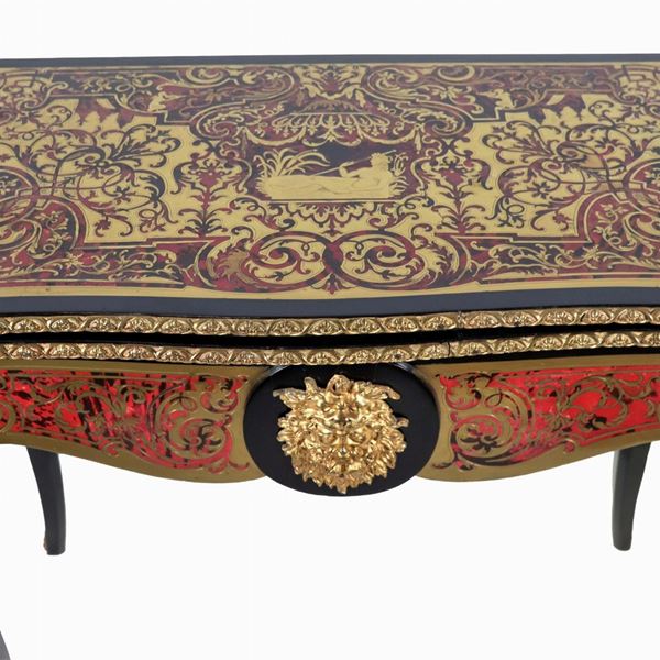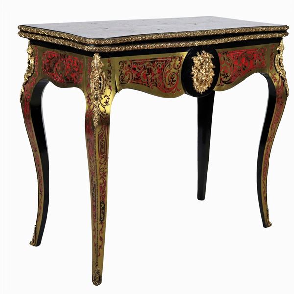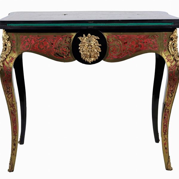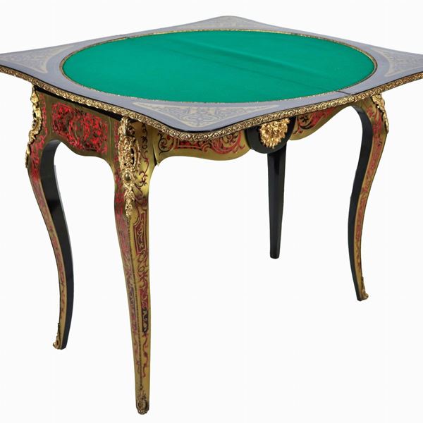 Tavolo da gioco francese Napoleone III (1852-1870), in legno ebanizzato con intarsi e filettature alla maniera Boulle, fregi e guarnizioni [..]