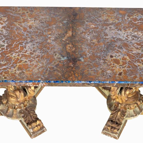 Tavolo da salotto con base formata da elementi di linea Luigi XIV in legno dorato, laccato e intagliato, piano in marmo lavorato