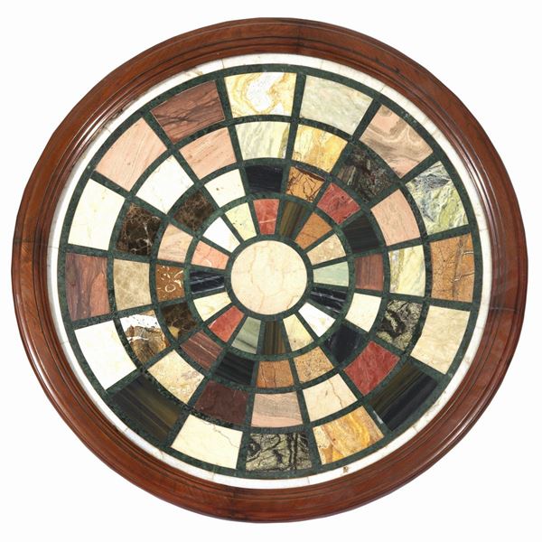 Tavolo romano Impero da centro a forma tonda, in mogano e piuma di mogano, con piano in vari marmi pregiati a tarsie geometriche, base a colonna [..]