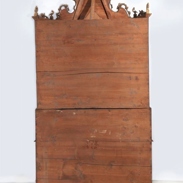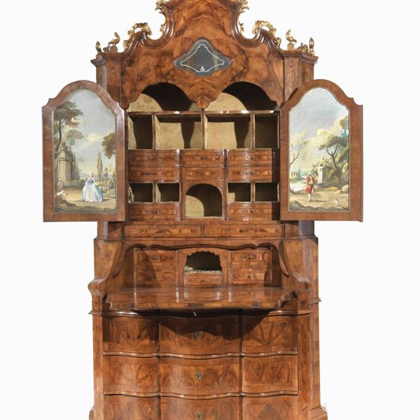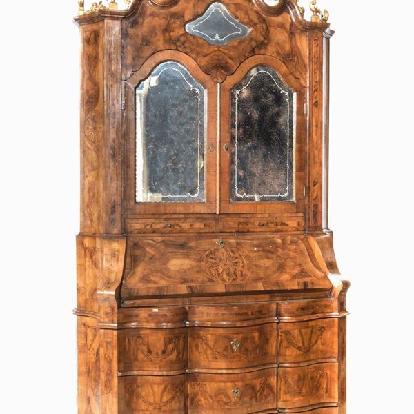 Trumeau veneziano di linea Luigi XV in noce e radica di noce, con filettature e rosoni intarsiati. La parte superiore con due sportelli a vetri [..]