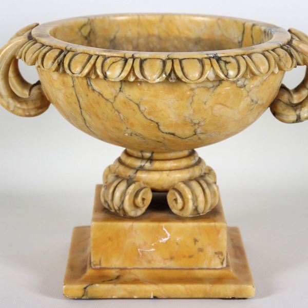 Vasca romana a forma tonda in marmo giallo venato, con manici ricurvi e bordo baccellato