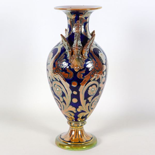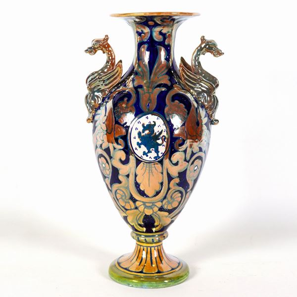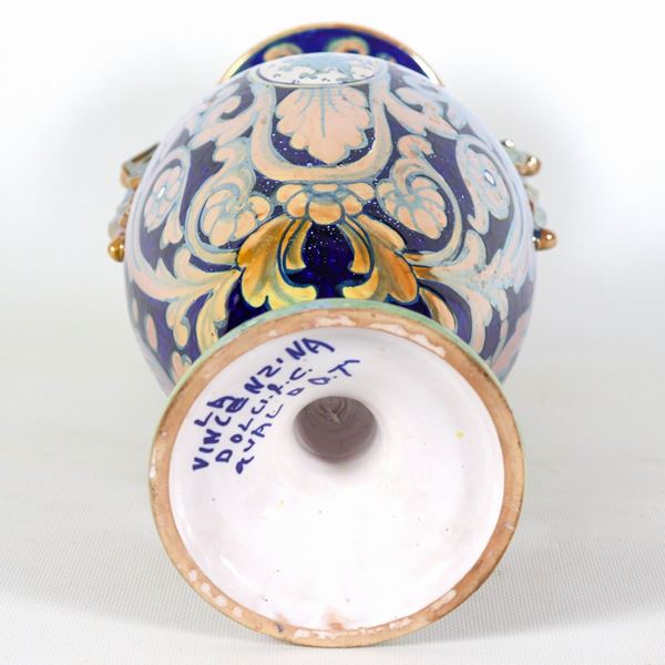 Vaso ad anfora in maiolica lustrata Gualdo Tadino, firmato La Vincenzina-O. Dolci e C., con decorazioni a volute e manici a forma di draghi