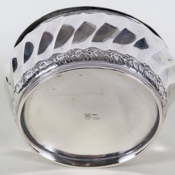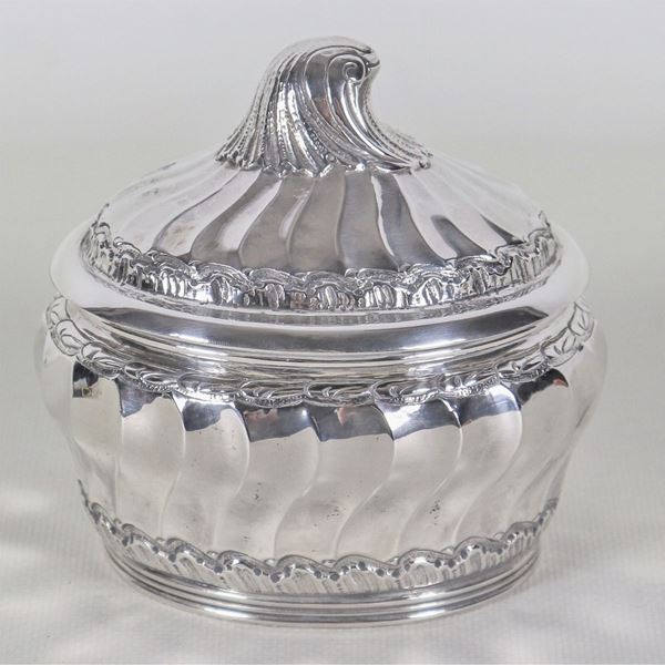 Zuccheriera ovale in argento Titolo 925, interamente cesellata e sbalzata a motivo torchon, gr. 240