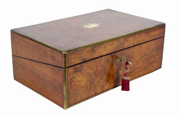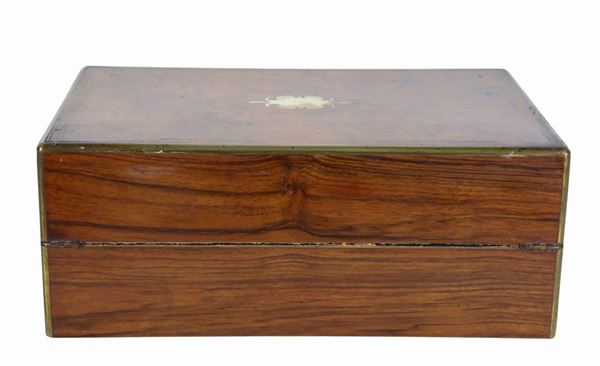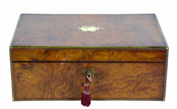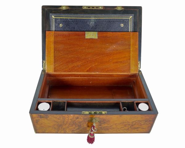 Antico scrittoio da viaggio inglese Epoca Vittoriana in radica di noce con coperchio ribaltabile. All'interno scrittoio con copertura in pelle, [..]