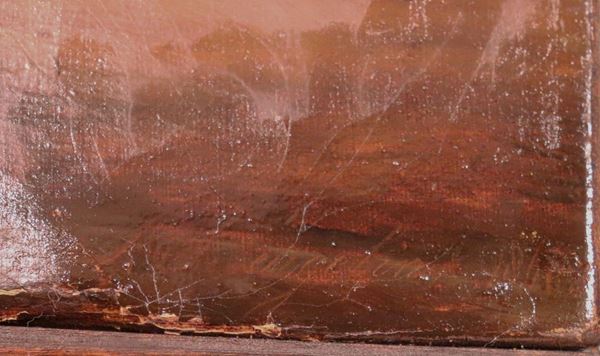 Firmato. "Mamma e figlioletta con cane e cucciolata", piccolo dipinto ad olio su tela