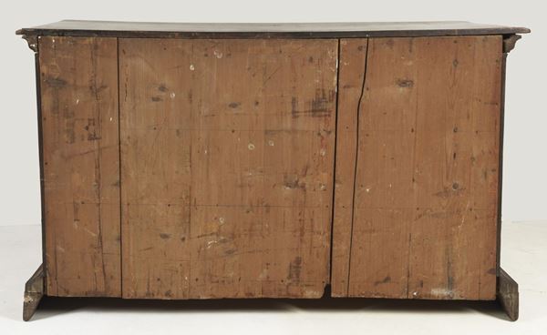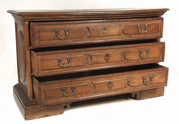 Canterano emiliano Luigi XIV in noce con bugnature a rilievo, tre tiretti e gambe a ciabatta, mancante di una bocchetta esterna ad una serrat [..]