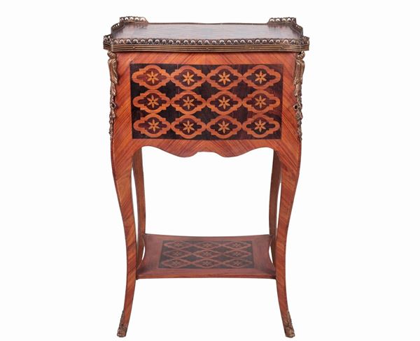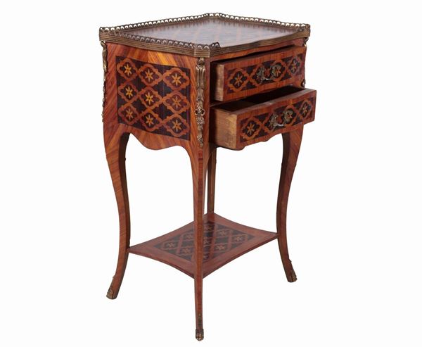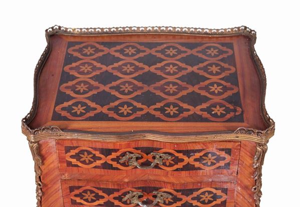 Comodino francese in bois de rose ed ebano viola, interamente intarsiato a motivi di rombi intrecciati e fiori, due tiretti e quattro gambe [..]