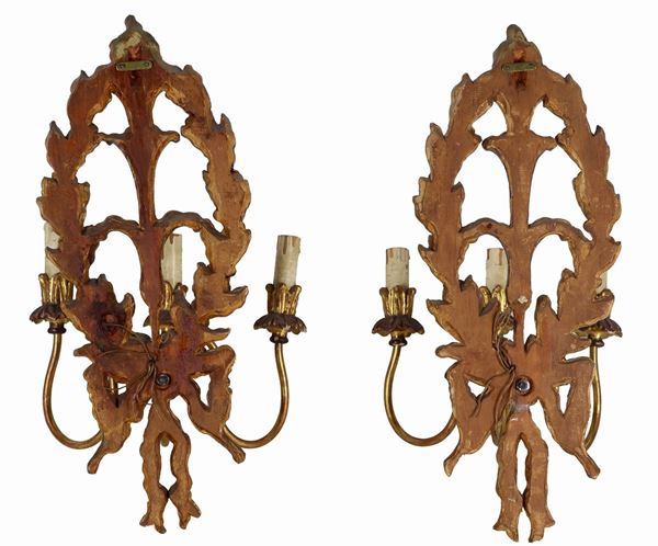 Coppia di appliques di linea Luigi XVI in legno dorato, argentato e intagliato, tre luci ciascuna